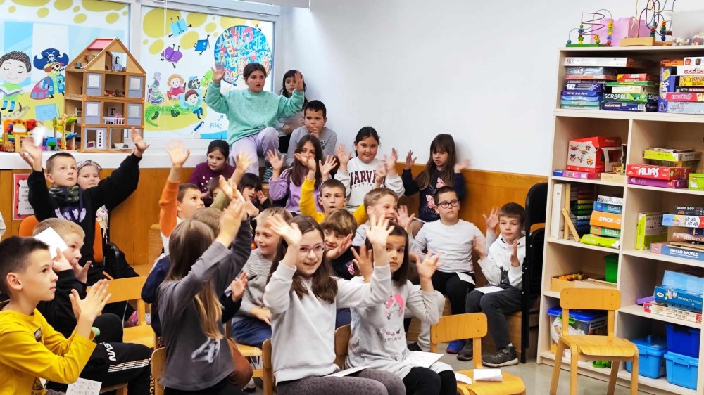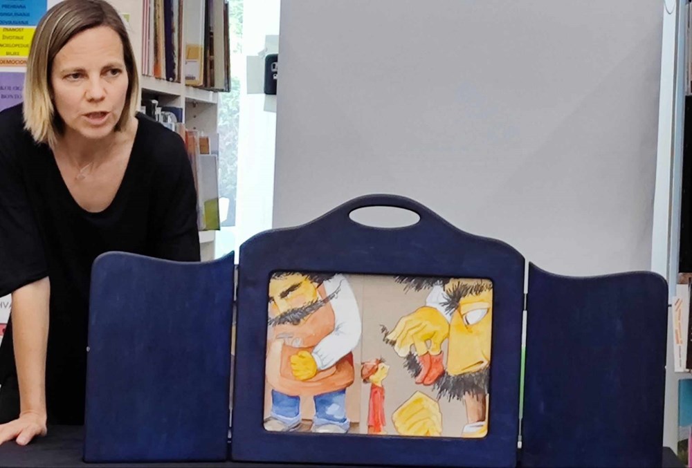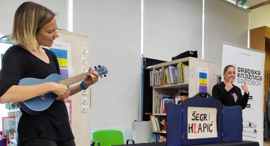 Vera Pfaff je uz pripovijedanje pomoću ilustracija u butaju, pjevala pjesmu o Hlapiću i svirala ukulele. Uz nju je Iwa Dugač iz Udruge ”Zaželi” prevodila priču na znakovni jezik. Publici je bilo vrlo zanimljivo i svi su aktivno sudjelovali u predstavi. Na kraju su naučili znakovnu abecedu te kako pokazati likove iz priče na znakovnom jeziku i predstaviti se.