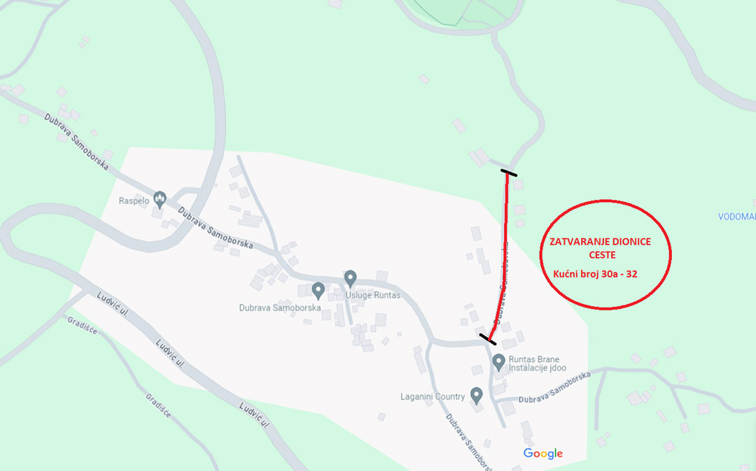 Zbog hitne sanacije kolnika na lokaciji Dubrava Samoborska 30b, a zbog sigurnosti svih sudionika u prometu, za sav se promet od petka, 21. lipnja zatvara dio nerazvrstane ceste u Dubravi Samoborskoj i to od kućnog broja 30a do kućnog broja 32, javljaju iz Grada.