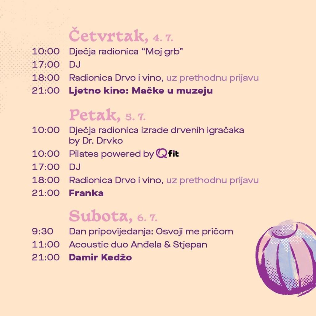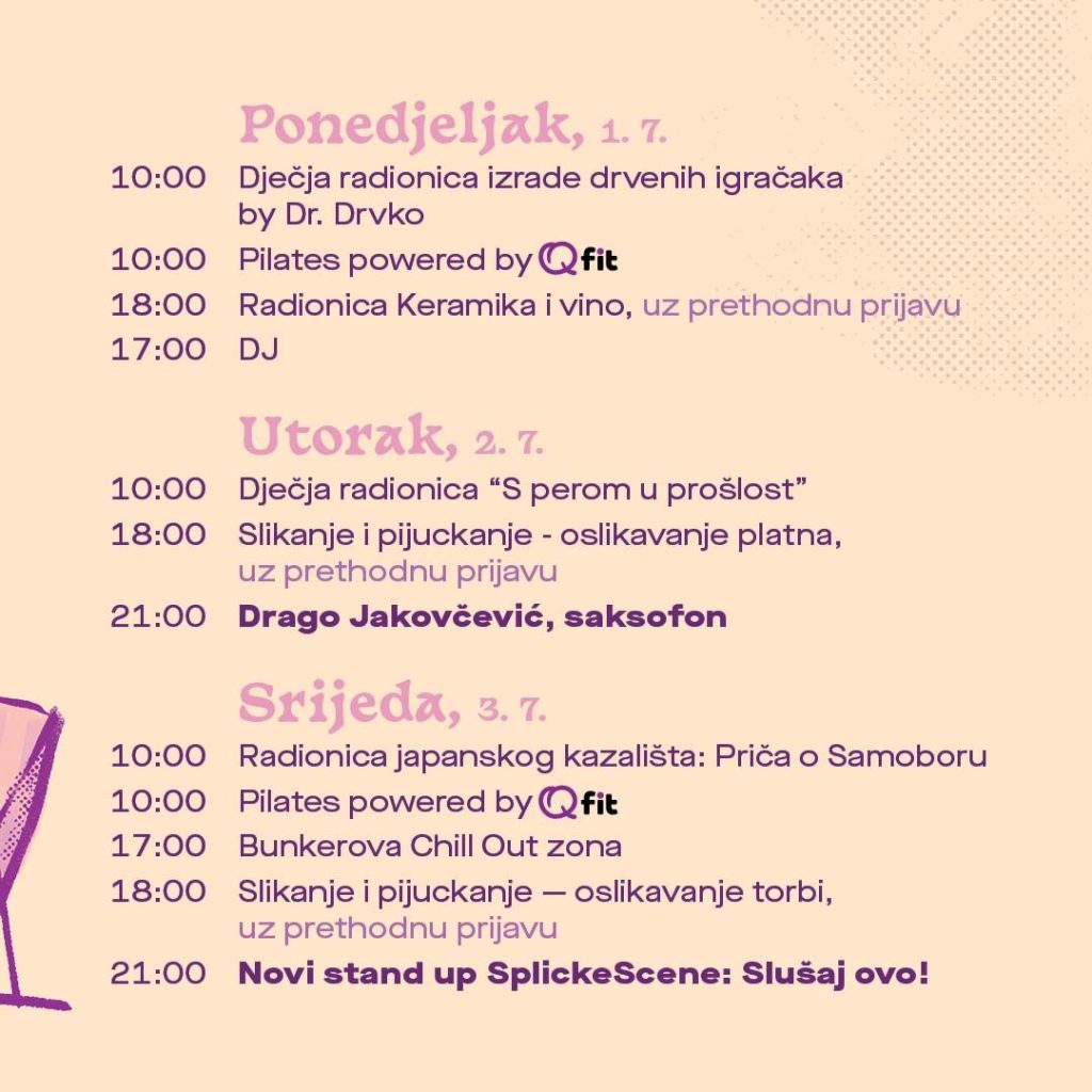 Dok mališani uživaju u njihovom programu, odrasli se mogu razgibati uz Pilates powered by Qfit ili se u popodnevnim satima pridružiti radionicama koje spajaju Samoborcima najdraže vino i umjetnost: “Keramika i vino”, “Slikanje i pijuckanje”, “Drvo i vino”. Uživati se može i u Bunkerovoj Chill Out zoni, a pripremljene su u popodnevnim i večernjim satima predstava za djecu “Vuk i sedam kozlića”, doza humora uz “Novi stand up SplickeScene: Slušaj ovo!” te gledanje filma “Mačke u muzeju” na velikom platnu pod vedrim ljetnim nebom.