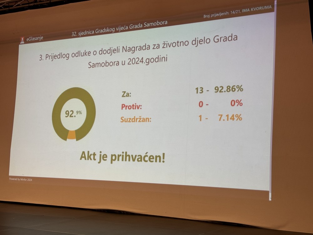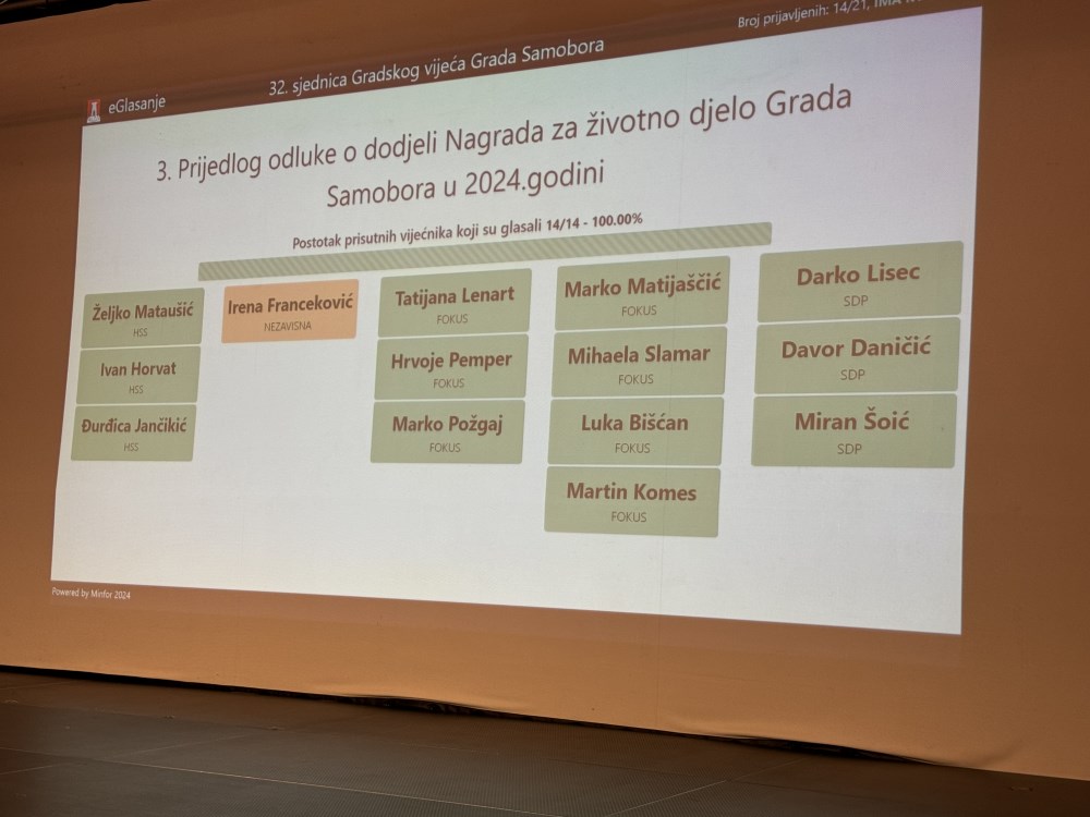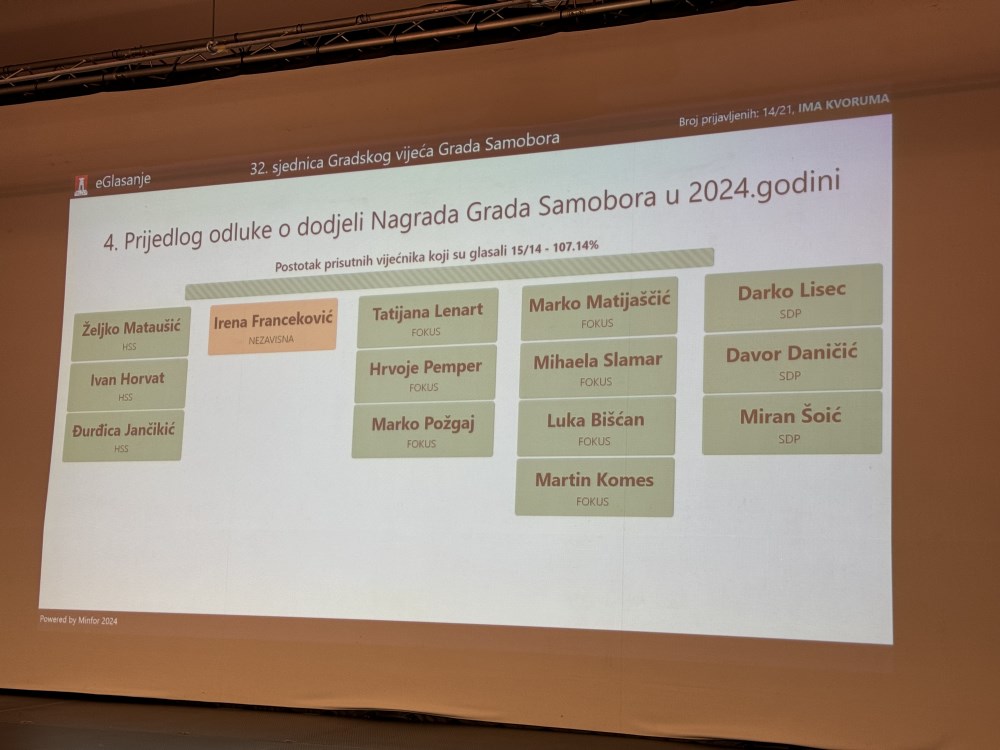 Vijećnica Irena Franceković je pitala iz kojih razloga i prema kojim kriterijima nije prošao prijedlog da Nagradu grada Samobora dobije tvrtka Skemark usluge, koja je osnovana 2022. i koja je dosad pokazala neke rezultate u zapošljavanju osoba s invaliditetom. Pročelnica Upravnog odjela za opće, pravne i tehničke poslove Valentina Horvat prenijela je da je stav Odbora za dodjelu nagrada i priznanja bio da društvo prekratko djeluje i da je još u pilot projektu, pa će mu se dati prilika da se dokaže. Odgovorio je i predsjednik Gradskog vijeća i Odbora Miran Šoić rekavši kako se o dodjeli puno raspravljalo i vagalo te da su ovaj izglasani prijedlog podržali i drugi odbori koji u tome sudjeluju.