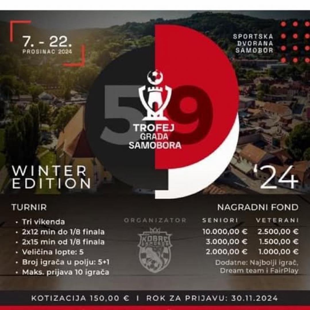 U novom izdanju emisije Športofon predstavili smo novo izdanje najstarijeg malonogometnog turnira u našim krajevima, Trofeja Grada Samobora. O 59. izdanju čiji ukupni nagradni fond iznosi čak 20 tisuća eura, koje će se od 7. prosinca održavati u organizaciji HNK Kobre Samobor i koje okuplja više od 90 momčadi, govorili su članovi organizacijskog odbora Mario Antunović, Danijel Sokolović i Ričard Brešković.