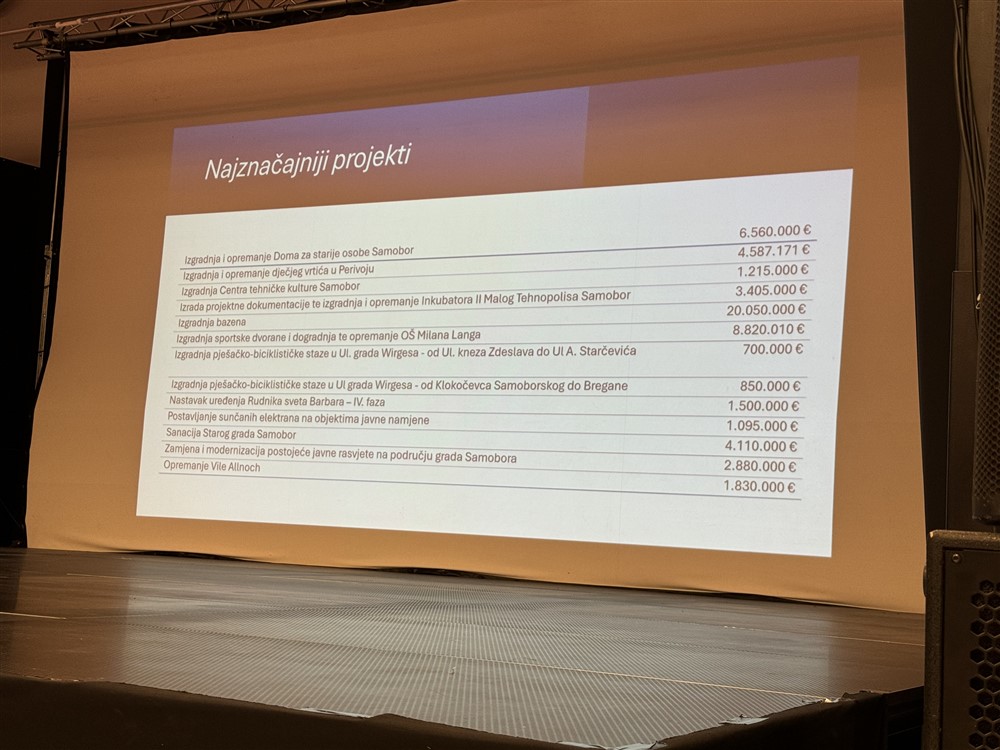U plan su s popriličnim sredstvima ubačeni i izgradnja bazena i koncertne dvorane te rekonstrukcija gradske tržnice. Za te projekte bit će potrebna i dodatna zaduženja u 2026. i 2027. godini i to od skoro 40 milijuna eura u te dvije godine, a u dolazećem trogodišnjem razdoblju planiran je i niz drugih ulaganja. Između ostalog se tako navodi izgradnja Centra tehničke kulture, uređenje drugog Inkubatora Malog Tehnopolisa Samobor, nastavak uređenja Rudnika Sveta Barbara, sanacija Starog grada, nabava novih vatrogasnih vozila te postavljanje sunčanih elektrana na objekte javne namjene.