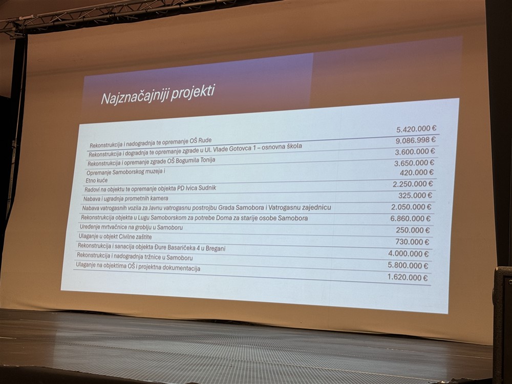 Među gradskim projektima zacrtanima u novom proračunu su i već započeti kao što je dogradnja Osnovne škole Milana Langa u Bregani i izgradnja tamošnje sportske dvorane, rekonstrukcija i nadogradnja Osnovne škole Rude, ali i izgradnja novog Doma za starije na gmajni u Maloj Rakovici i rekonstrukcija objekta u Lugu za Dom za starije te izgradnja dječjeg vrtića u Perivoju, zatim opremanje Samoborskog muzeja i Vile Allnoch, nastavak radova na Planinarskom domu Ivica Sudnik te modernizacija javne rasvjete i nastavak izgradnje pješačko-biciklističkih staza.