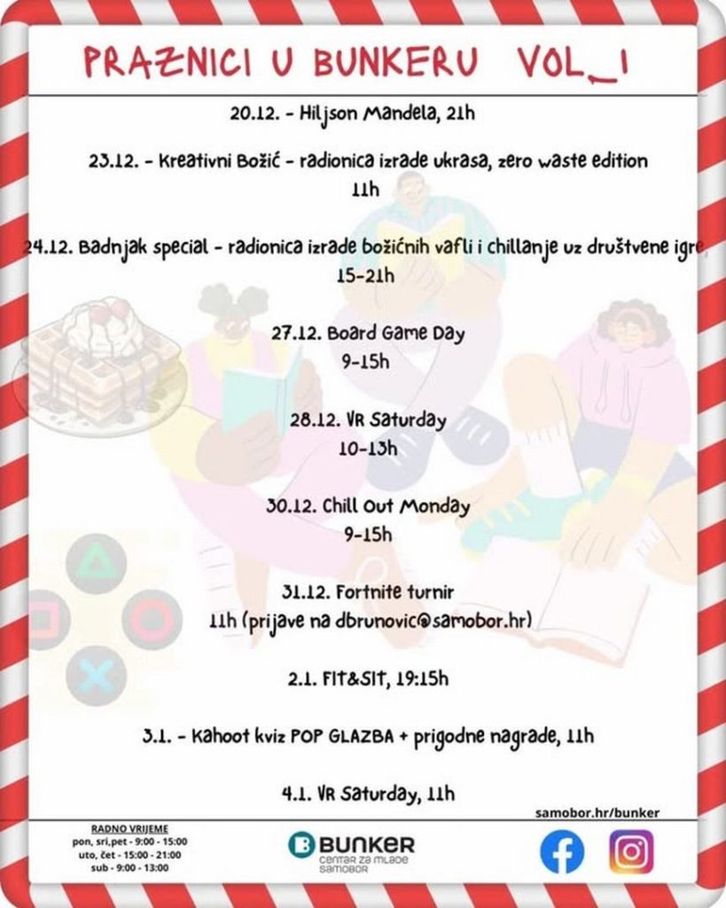 Potom, 23. prosinca s početkom u 11 sati održava se radionica izrade ukrasa, a na Badnjak od 15 do 21 sat Bunker će otvoriti svoja vrata za izradu božićnih vafli i opušteno druženje uz društvene igre.