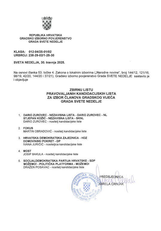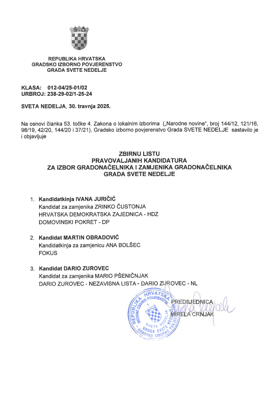 Zbirne liste kandidacijskih lista za izbor gradonačelnika ili gradonačelnice, Gradskog vijeća te vijeća mjesnih odbora objavilo je Gradsko izborno povjerenstvo Svete Nedelje.