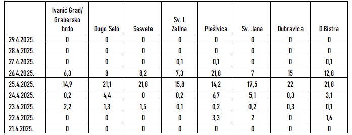 Od posljednje preporuke za zaštitu vinograda proteklo je 10 dana tijekom kojih bilježimo porast dnevnih temperatura zraka, srednje dnevne 16 -18 C, maksimalne 22 – 26,6 C što uz dovoljno vlage u tlu uvjetuje intenzivan porast mladica koje prelaze 20 -tak centimetara (chardonnay, škrlet, muškat). Veće količine oborina zabilježene su u dane 24 -26. travnja: