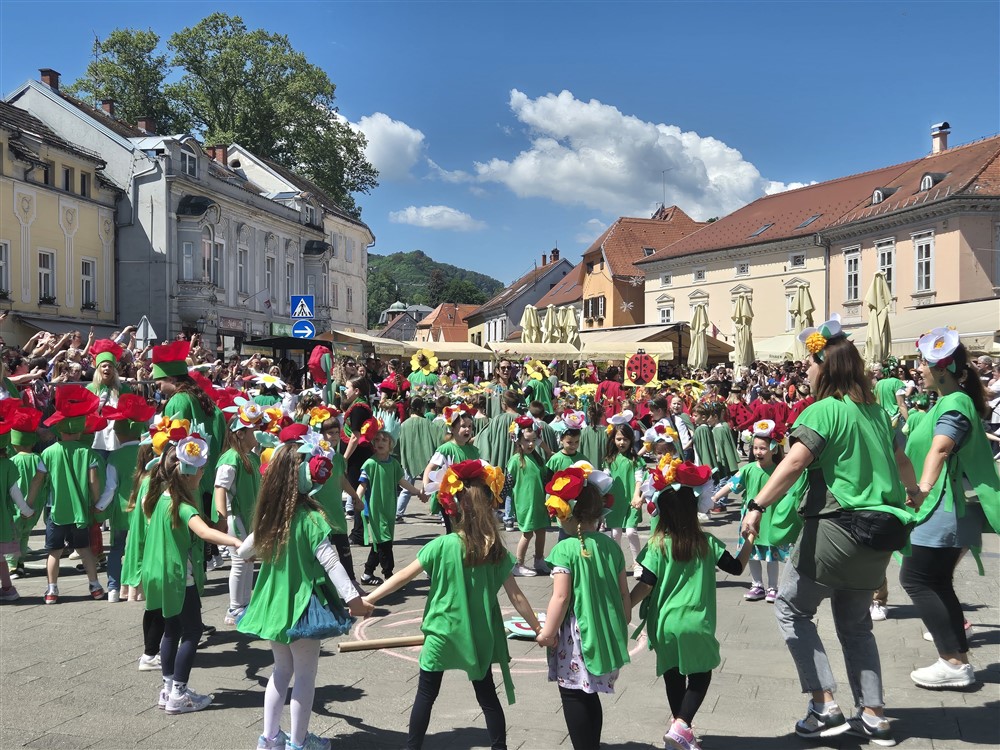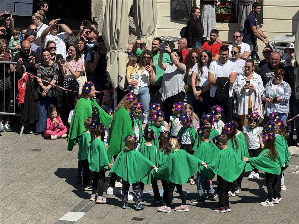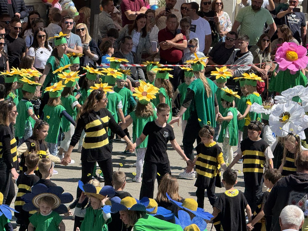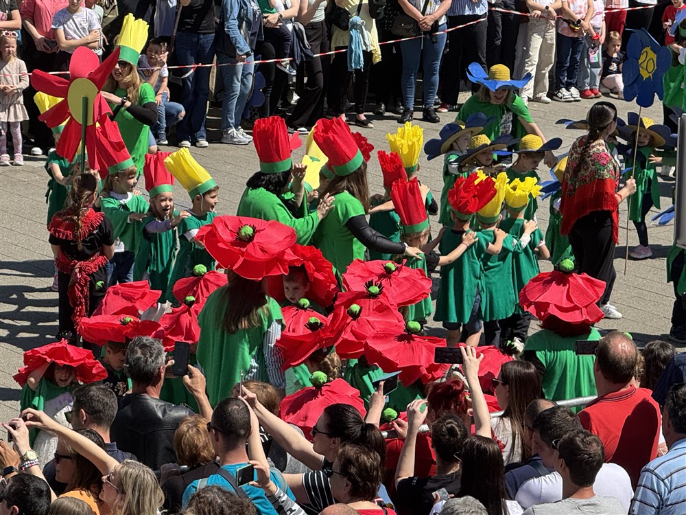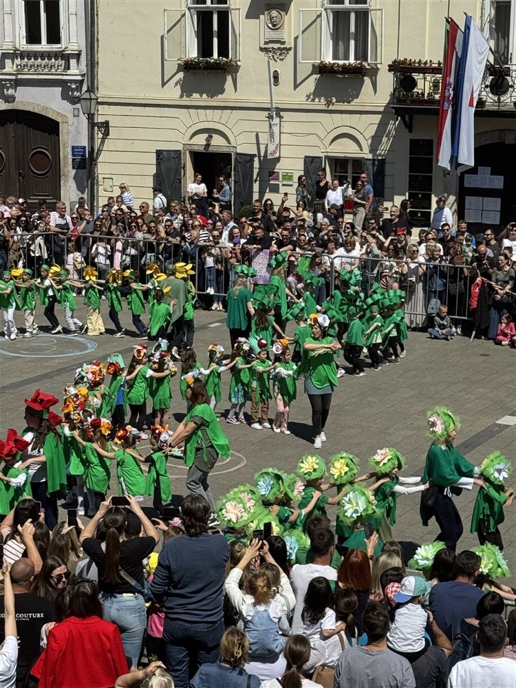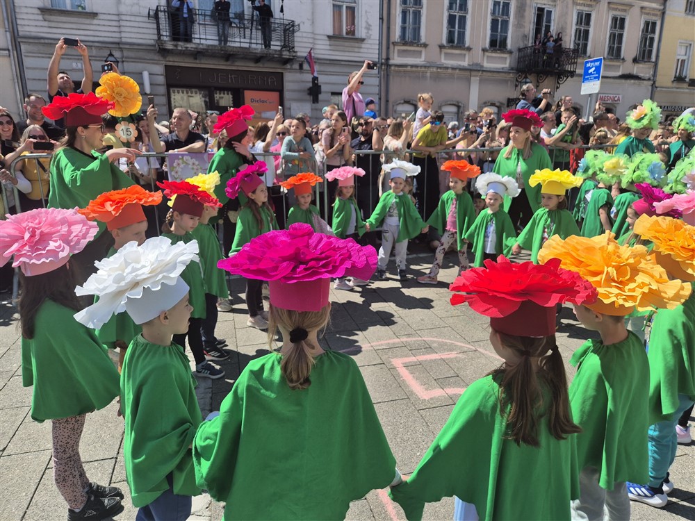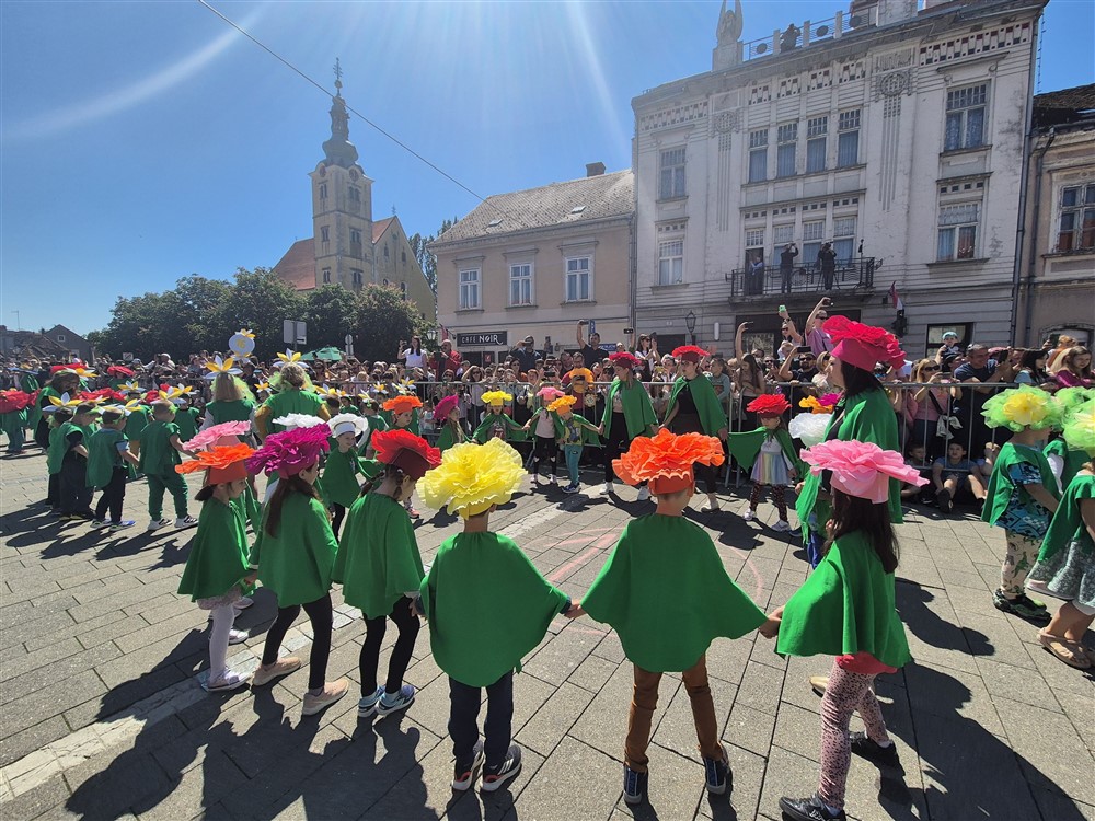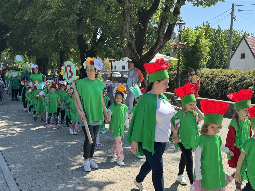 Zadivili su svojim šarenim cvjetnim kostimima, prošetavši iz parka Dječjeg vrtića Izvor u Mlinskoj ulici do Trga kralja Tomislava, gdje su i izveli plesni program od desetak tradicionalnih hrvatskih folklornih plesova.