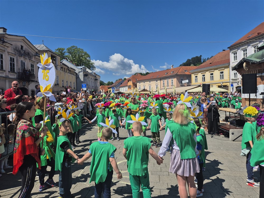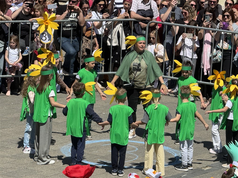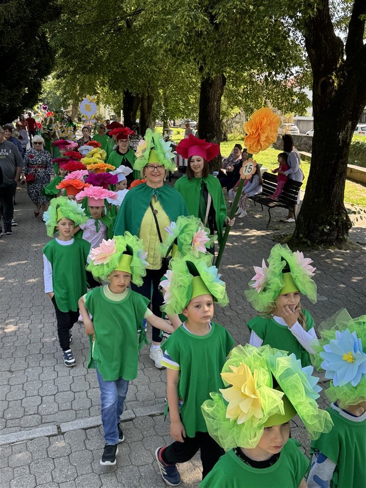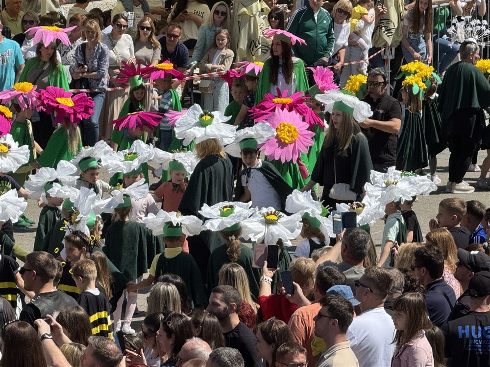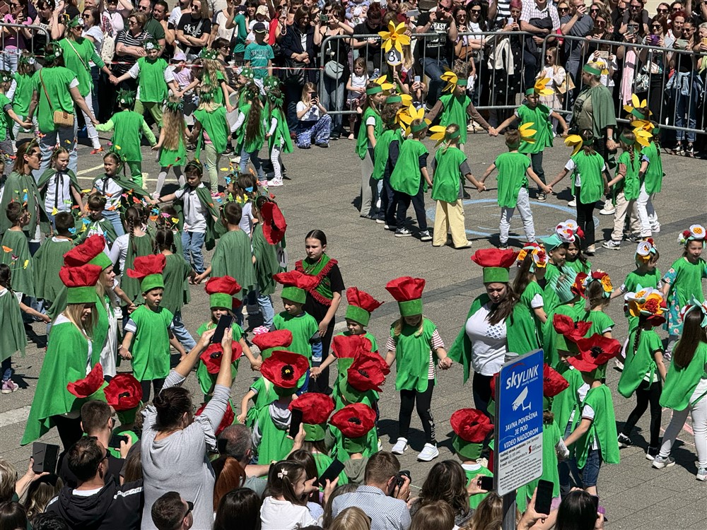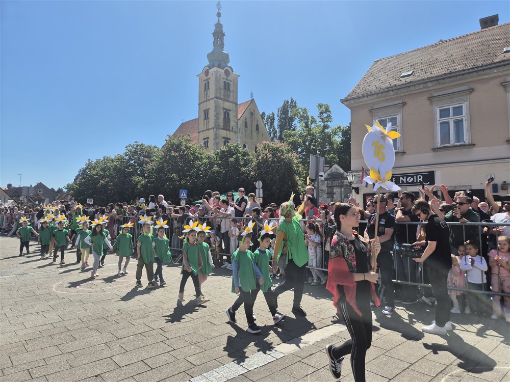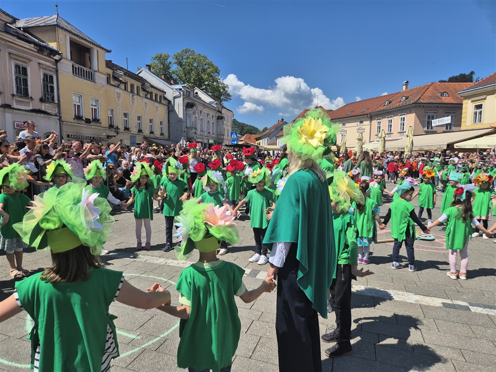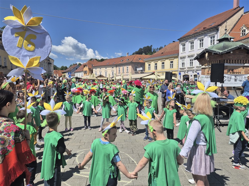 Zadivili su svojim šarenim cvjetnim kostimima, prošetavši iz parka Dječjeg vrtića Izvor u Mlinskoj ulici do Trga kralja Tomislava, gdje su i izveli plesni program od desetak tradicionalnih hrvatskih folklornih plesova.