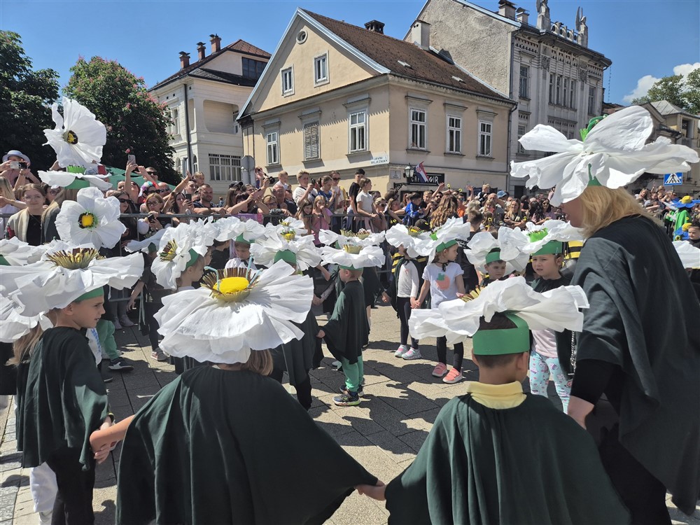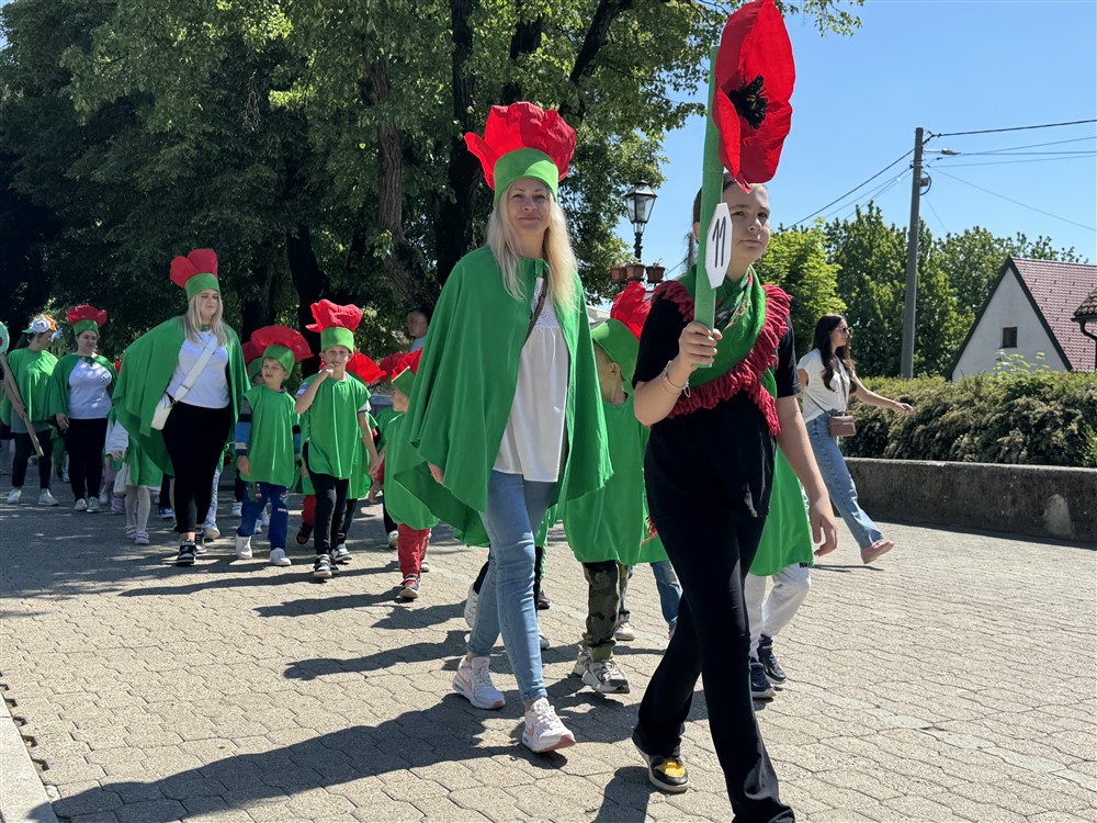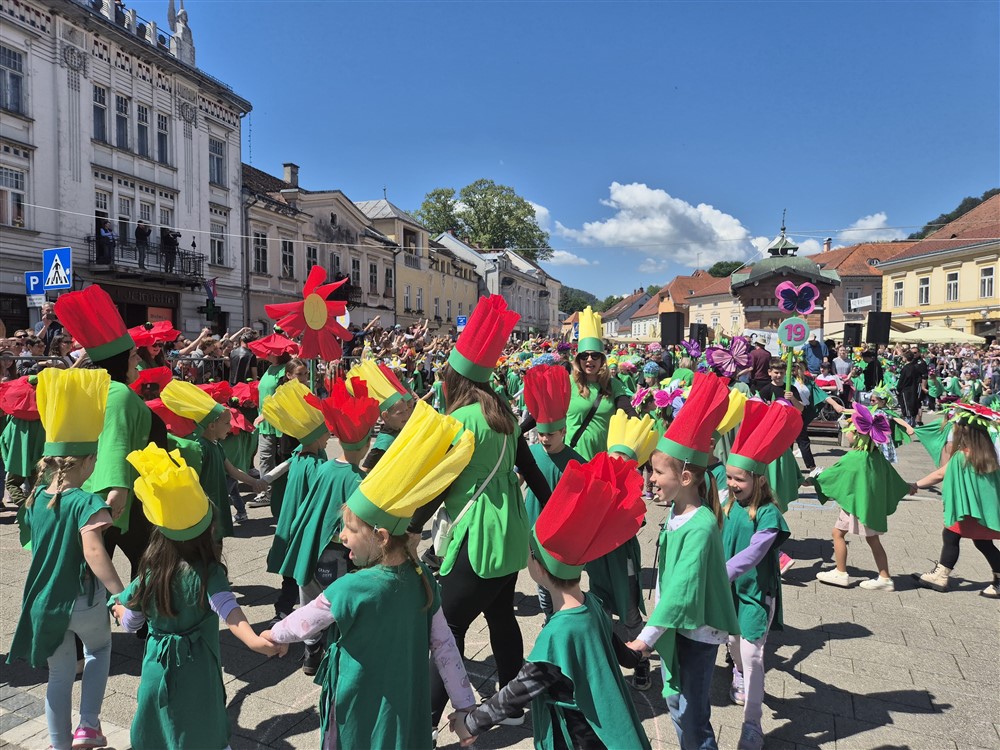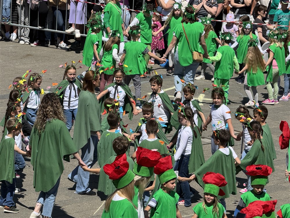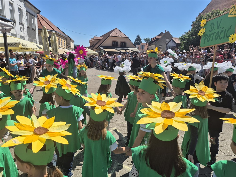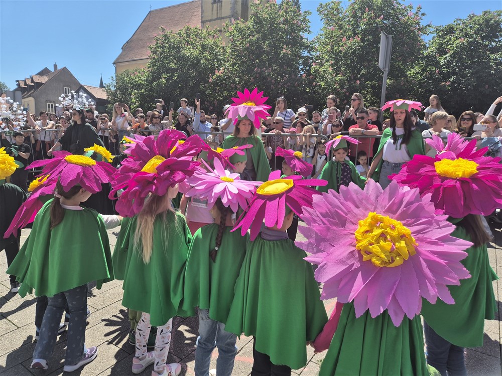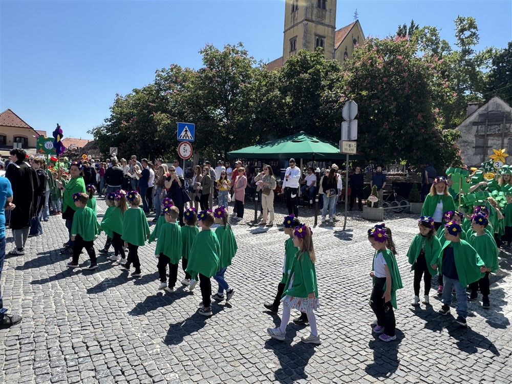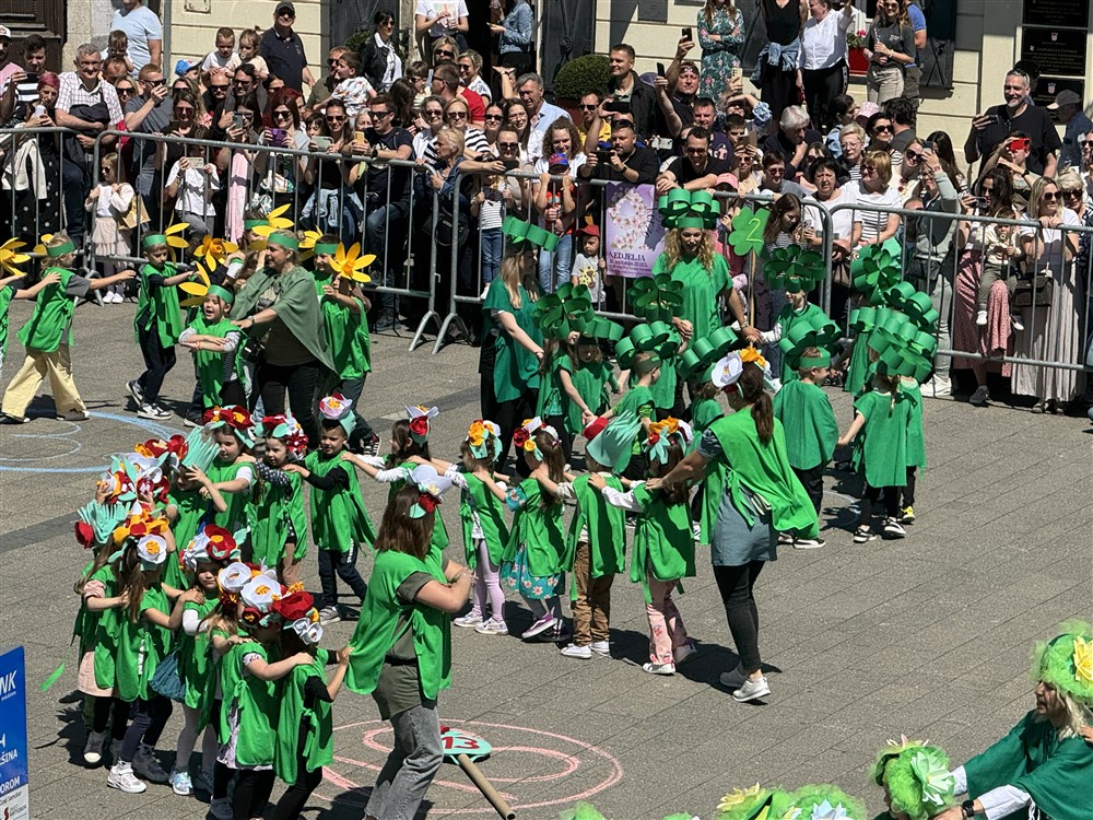 Zadivili su svojim šarenim cvjetnim kostimima, prošetavši iz parka Dječjeg vrtića Izvor u Mlinskoj ulici do Trga kralja Tomislava, gdje su i izveli plesni program od desetak tradicionalnih hrvatskih folklornih plesova.