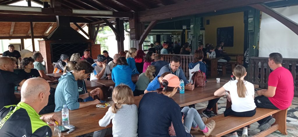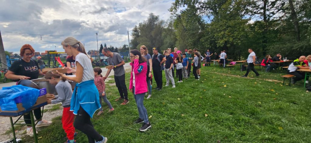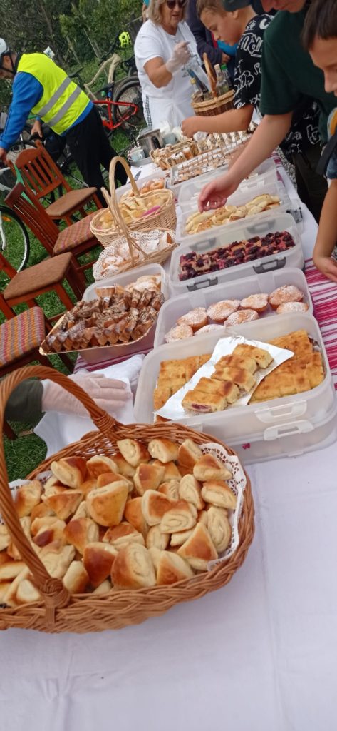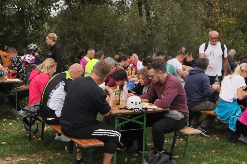 Prvo zaustavljanje organizirano je u Medsavama gdje su dobrodošlicu biciklistima zaželjele vesele članice udruge Etno Fletno, uz razne kolače i druge slastice, sokove, rakijicu i pjesme. Svi su imali mogućnost da se skelom prevezu i preko Save.
