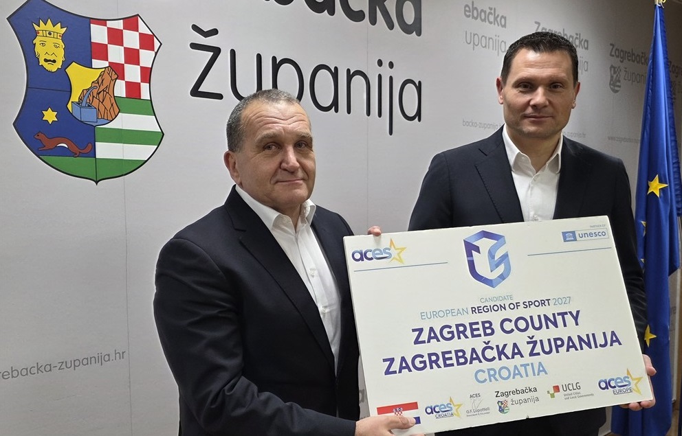 Zagrebačka županija službeno je ušla u utrku za prestižni naslov Europske regije sporta 2027. Certifikat o prihvaćanju kandidature danas je, u utorak, 10. veljače, u prostorijama Županije zamjeniku župana, Ervinu Kolarecu, uručio partner udruženja ACES iz Bruxellesa Berislav Čižmek. Time je započet službeni evaluacijski postupak koji Zagrebačku županiju svrstava među najaktivnije europske regije u razvoju sporta i promicanju zdravog načina života.