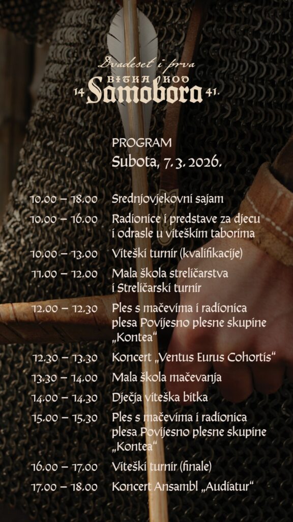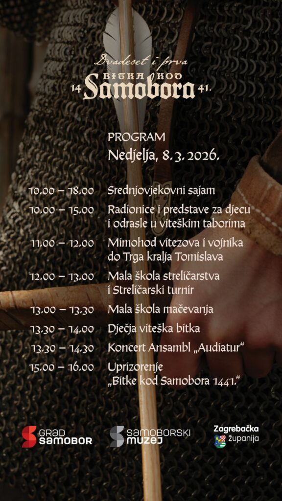 Livada Vugrinščak će se u subotu i nedjelju, 7. i 8. ožujka, po 21. put vratiti u srednji vijek s mnogobrojnim vojnim taborima, vitezovima i tradicionalnim sajmovima, kada će se uprizoriti još jedna Bitka kod Samobora iz davne 1441. godine, koja se u stvarnosti odvila negdje na području današnjeg Domaslovca.